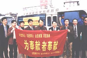 2003年4月26日,本公司與共青團(tuán)南京市委、南京市青年聯(lián)合會組織部分青年代表帶著全市青年的心愿,向廣大奮斗在抗非典一線的醫(yī)務(wù)工作者送去錦旗和慰問品,表達(dá)對奉獻(xiàn)者真摯的祝福。在江蘇省人民醫(yī)院,當(dāng)院領(lǐng)導(dǎo)和醫(yī)護(hù)人員從團(tuán)市委書記許宏和圣和藥業(yè)董事長王勇手中接過錦旗和慰問品時深為感動。他們表示有全市人民的大力支持,一定能戰(zhàn)勝“非典”惡魔,奪取抗非典戰(zhàn)斗的勝利。許宏書記和王勇董事長對奮戰(zhàn)在抗非典一線的醫(yī)務(wù)人員所表現(xiàn)出的崇高精神表示欽佩,對他們所做的工作表示感謝,并囑咐他們一定要保重身體。