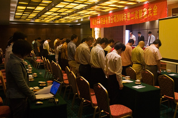 圖為公司員工會議之前集體為四川災(zāi)區(qū)遇難同胞默哀