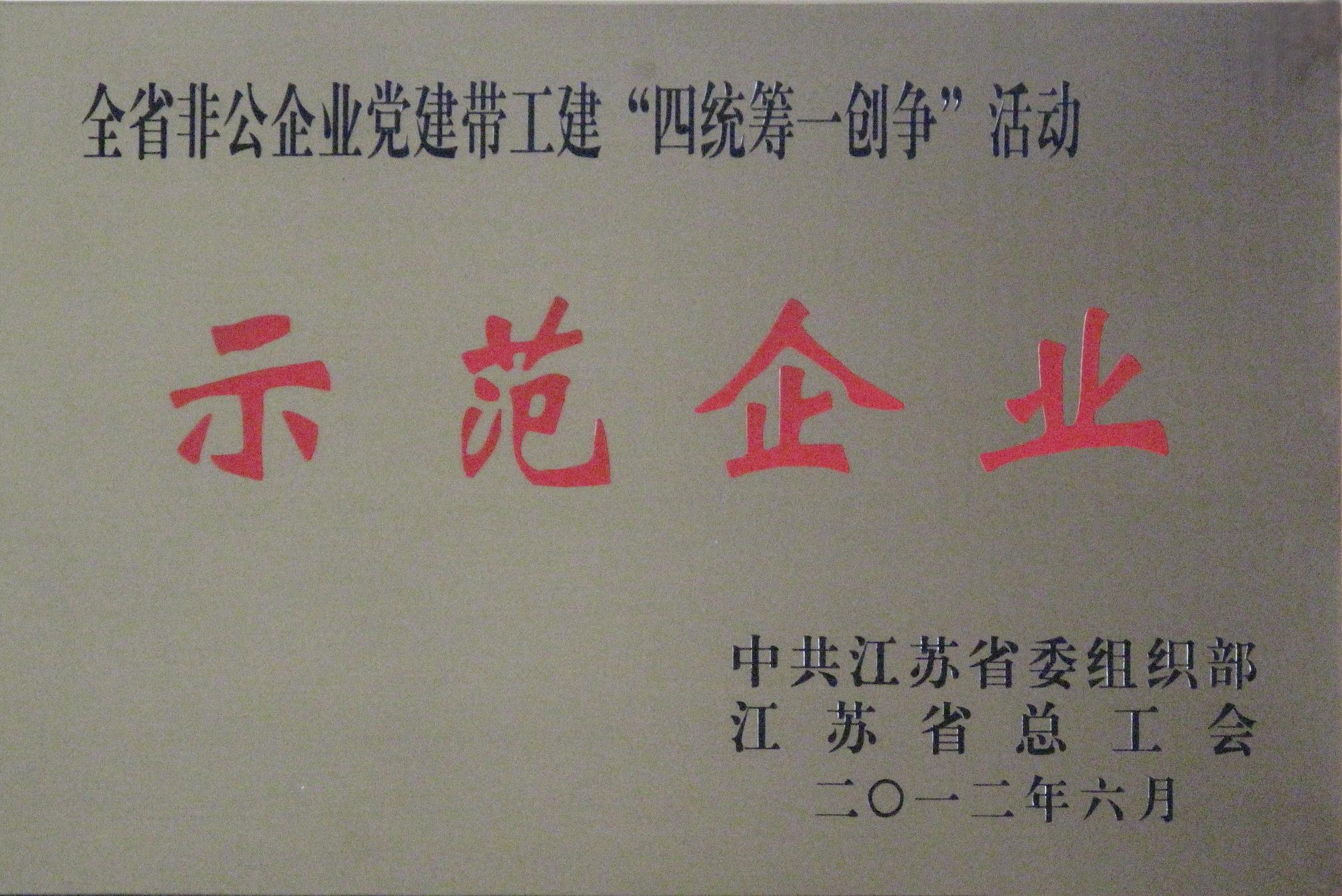 本網(wǎng)訊 6月21日下午,江蘇省黨建帶工建“四統(tǒng)籌一創(chuàng)爭(zhēng)”活動(dòng)示范企業(yè)示范片區(qū)集中授牌儀式在南京舉行。會(huì)上,江蘇省委組織部、省總工會(huì)向首批300家示范企業(yè)和30個(gè)示范片區(qū)授牌,我公司被命名為“全省黨建帶工建”四統(tǒng)籌一創(chuàng)爭(zhēng)“活動(dòng)示范企業(yè)”。集團(tuán)黨總支書(shū)記、工會(huì)主席戚良猛同志出席授牌儀式。
