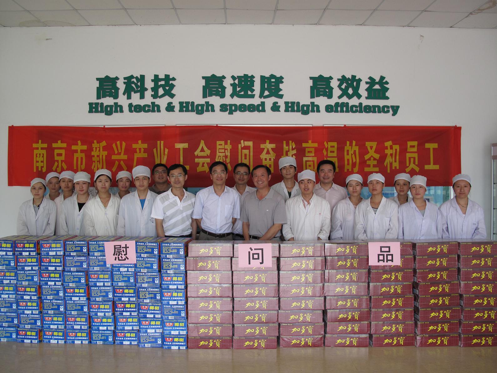 本網訊 7月24日,夏日炎炎,南京市新興產業(yè)工會郎岳主席一行三人在集團工會主席戚良猛同志的陪同下,冒著酷暑來到我司新港生產基地,慰問奮戰(zhàn)在生產一線的廣大職工,為一線職工送上了防暑降溫慰問品,給職工們帶來了清涼和關懷。