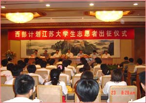 2003年8月23日上午,團(tuán)省委、省教育廳、省財(cái)政廳、省人事廳聯(lián)合舉行江蘇大學(xué)生志愿服務(wù)西部計(jì)劃出征儀式,歡送我省415名大學(xué)生志愿者赴陜西、廣西、云南三省區(qū)貧困地區(qū)鄉(xiāng)鎮(zhèn)基層從事為期1—2年的教育、衛(wèi)生、農(nóng)技、扶貧等方面的志愿服務(wù)。省委副書(shū)記馮敏剛,省委常委、組織部長(zhǎng)徐國(guó)健,副省長(zhǎng)吳瑞林出席了儀式。