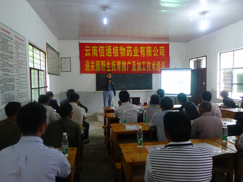 本網(wǎng)訊 8月25日,云南信通植物藥業(yè)有限公司生產(chǎn)技術(shù)部應(yīng)斗咀通關(guān)藤野生撫育基地負(fù)責(zé)人及當(dāng)?shù)剞r(nóng)戶邀請,組織人員至云南文山州馬關(guān)縣進(jìn)行了通關(guān)藤野生撫育推廣及加工技術(shù)培訓(xùn)。培訓(xùn)會議得到了當(dāng)?shù)卣块T和農(nóng)戶的積極配合和大力支持,馬關(guān)縣科協(xié)主席及秘書,坡腳鎮(zhèn)書記,興隆村支書、村長,各村小組組長、農(nóng)戶等近40人參加了培訓(xùn)。